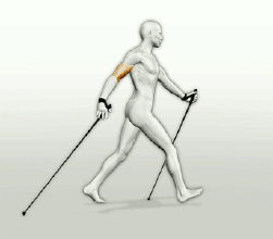 双杖握把朝前,步幅要大,正常摆臂,同时向前高效地推进身体。虎口压住杖带,抖动手腕。杖几乎拖着地正常行走。