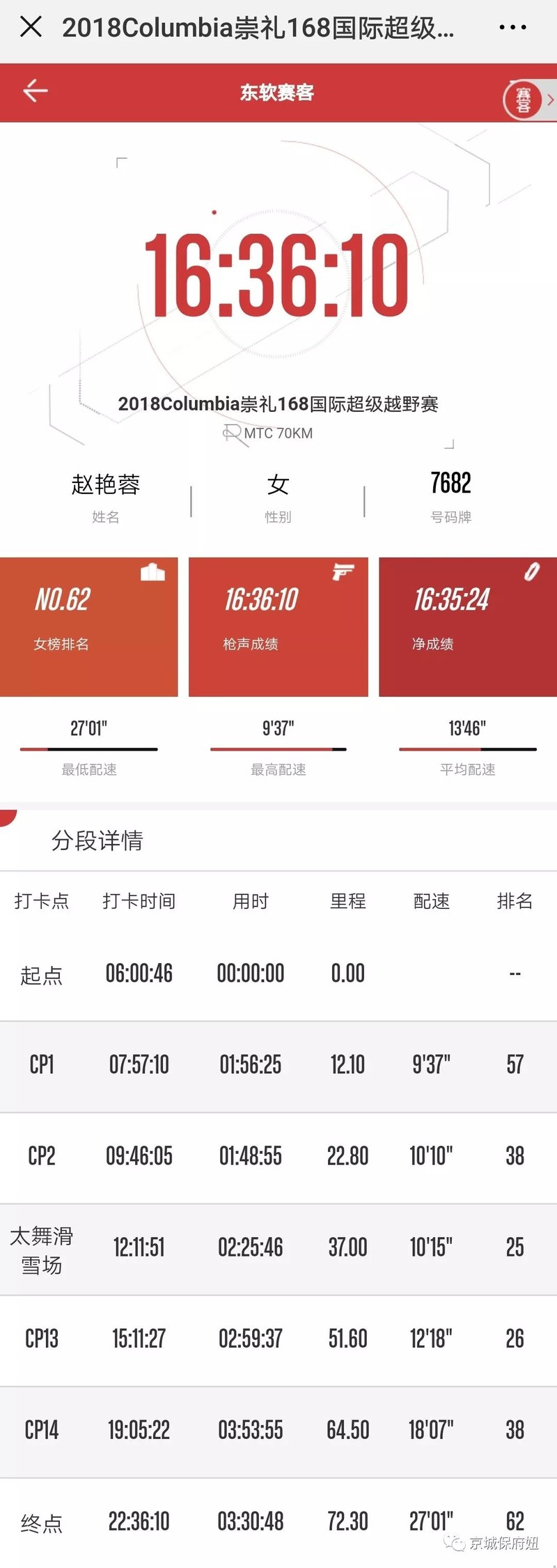 16个半小时,比赛前计划晚了2.5个小时。遗憾有很多,但当一切都结束的时候,我却释然了。